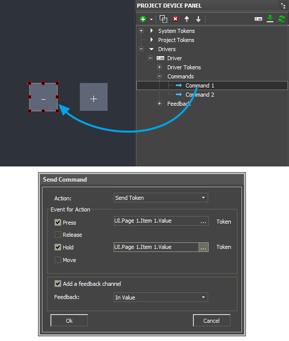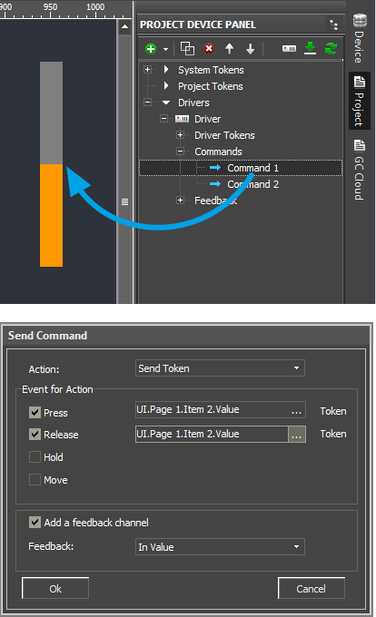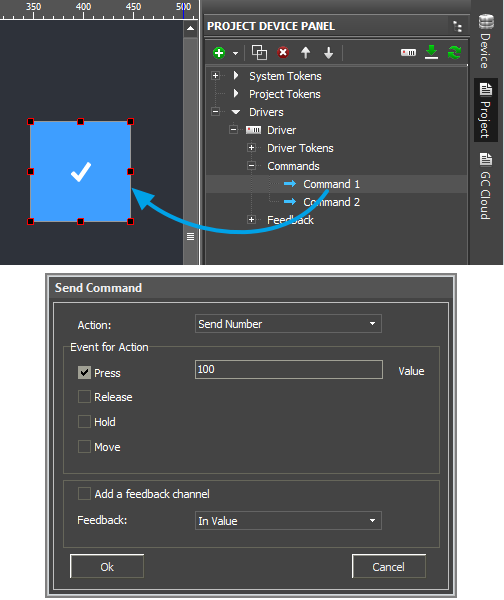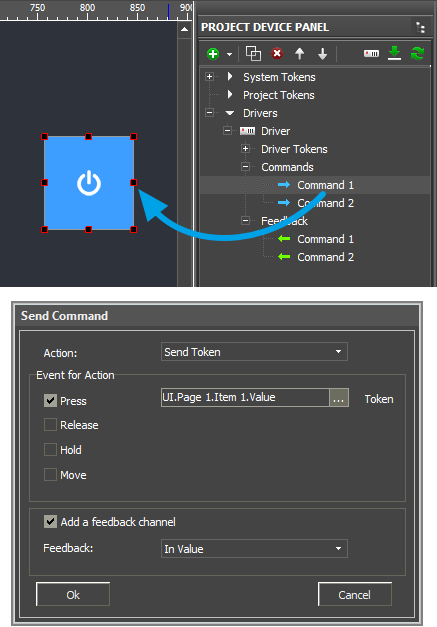 Используйте Drag&Drop, чтобы связать оборудование с интерфейсом визуализации. Тип элемента определяет, какие команды с него можно отправлять.