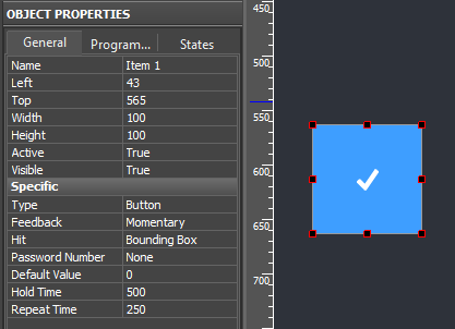 Создайте три графических элемента и задайте им следующие параметры в панели Свойства (Object Properties) во вкладке Programming :