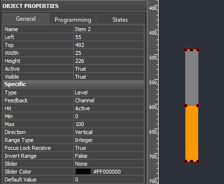 | Min / Max | Пределы регулирования уровня: определяют диапазон значений, в котором перемещается ползунок | |